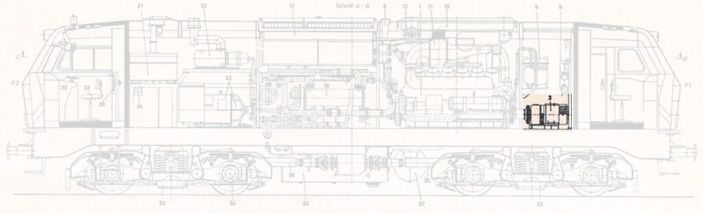 Schnitt einer BR218, hervorgehoben die Lichtanlassmaschine
